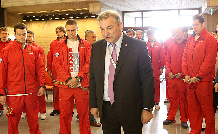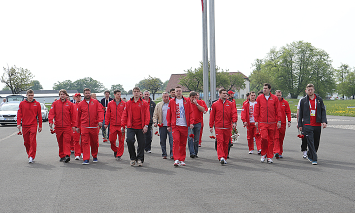 Сборная России приехала к мемориалу двумя группами. Первыми появились Сергей Бобровский и Владимир Тарасенко. У них свой предматчевый ритуал, на арену нужно прибыть за добрых три часа до начала игры, поэтому из-за раннего начала поединка они приехали к памятнику раньше всей команды. Здание главного мемориала еще было закрыто, поэтому Тарасенко и Бобровский возложили цветы прямо к памятнику двум солдата.