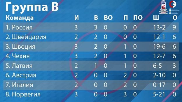 Победа над Чехией, которая в свою очередь обыграла Швецию, сделала шансы россиян занять первое место в группе очень высокими. Для этого, скорее всего, будет достаточно обыграть в основное время Швейцарию и набрать хотя бы одно очко в матче с "Тре Крунур".