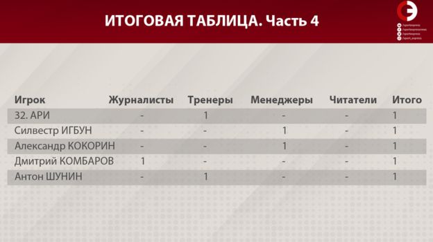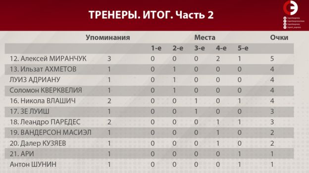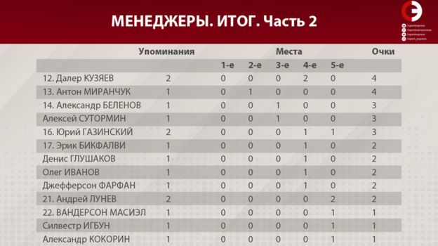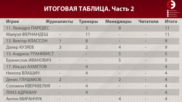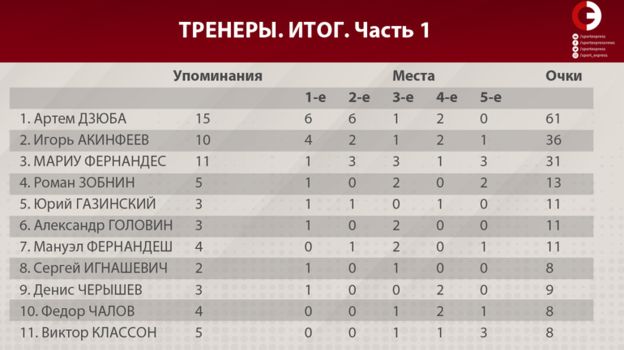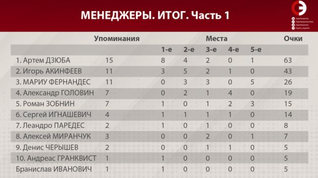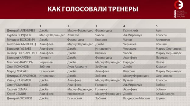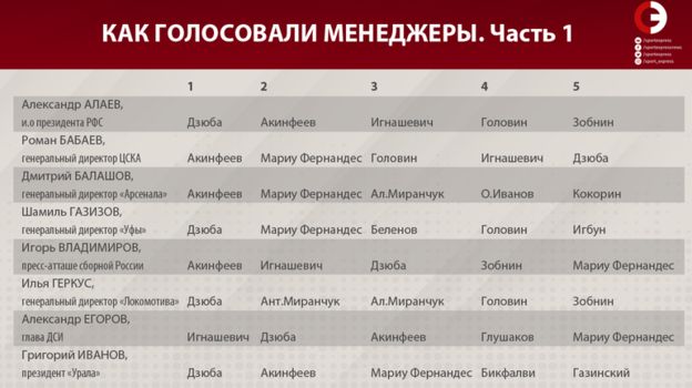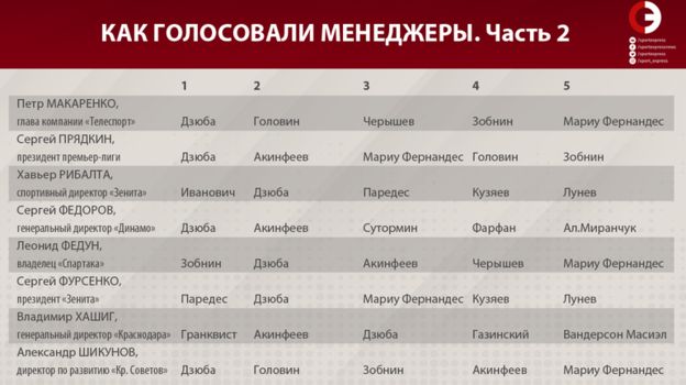 – Почти все представители клубов-лидеров чемпионата поставили на первое место своих игроков. Исключением стал босс "Локомотива" Геркус, поддержавший Дзюбу. Самым патриотичным стал спортивный директор "Зенита" Рибалта – он назвал только игроков клуба из Петербурга.Интересные факты: