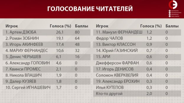 Ниже – весь список из 20 кандидатов, предложенных для народного голосования, с набранными процентами.У посетителей сайта "СЭ" наибольшие симпатии, помимо Дзюбы, вызвал спартаковец Зобнин, который на десятые доли процента опередил Акинфеева. Именно второе место в этой категории позволило Роману финишировать в топ-5 и вытеснить оттуда Александра Головина.