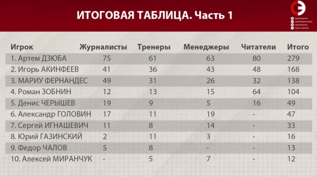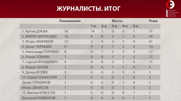 В этом году вне конкуренции оказался форвард "Зенита" и новый капитан сборной России Артем Дзюба, который опередил предыдущего капитана национальной команды – вратаря ЦСКА Игоря Акинфеева. Нападающий стал первым у всех четырех групп голосующих – тренеров, менеджеров, болельщиков и журналистов. Помимо Дзюбы и Акинфеева в итоговую пятерку вошли Мариу Фернандес (3), Роман Зобнин (4) и Денис Черышев (5).