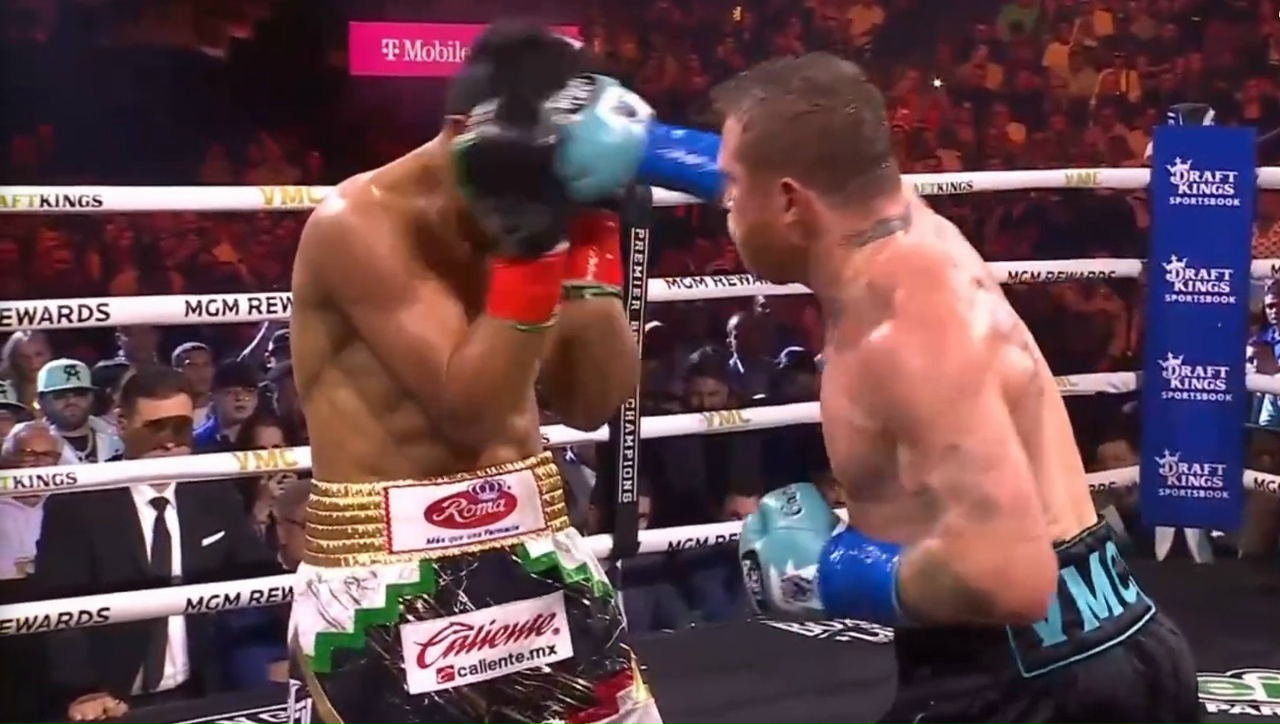Раунд 1. Мунгия занял центр ринга, качает и прижимает соперника к канатам. Канело в глубокой обороне, выбрасывает мощнейшие одиночные хуки по воздуху.