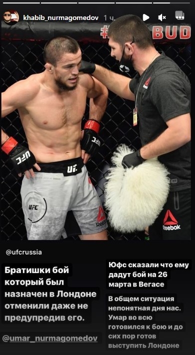 «Братишки, бой, который был назначен в Лондоне, отменили, даже не предупредив его. В UFC сказали, что ему дадут бой на 26 марта в Вегасе. В общем, ситуация непонятная для нас. Умар вовсю готовился к бою и до сих пор готов выступить в Лондоне», — написал Хабиб в сториз Instagram.