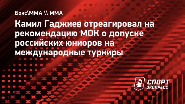 Президент AMC Fight Nights Камил Гаджиев в разговоре с «СЭ» отреагировал на рекомендацию Международного олимпийского комитета (МОК) о допуске российских молодых спортсменов на международные турниры.