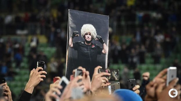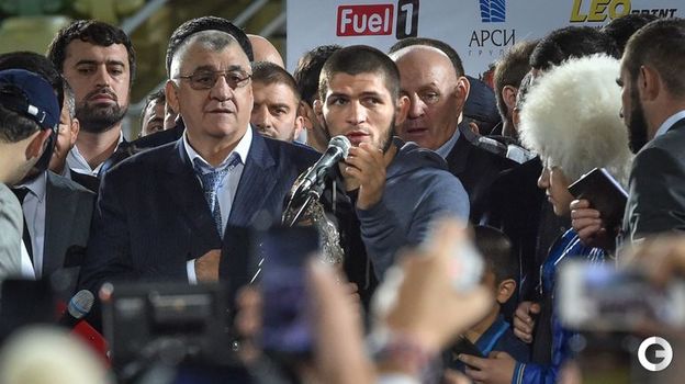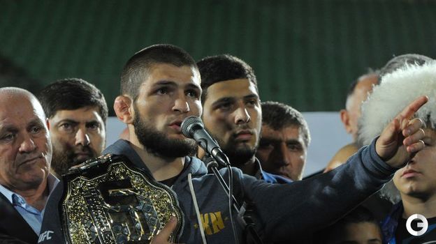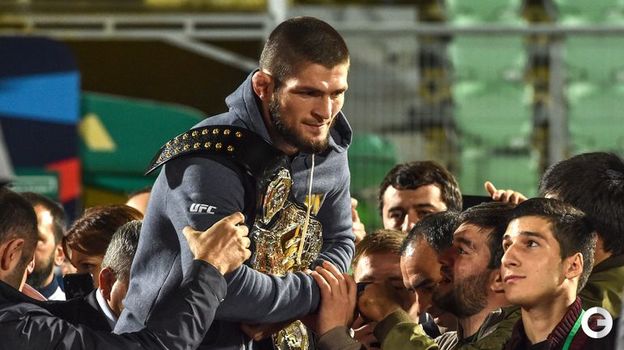 Хабиб Нурмагомедов в воскресенье одержал историческую победу над Конором Макгрегором, а вчера вечером прилетел в родную Махачкалу и тут же отправился на арену в Каспийске, где его ждала многотысячная толпа.