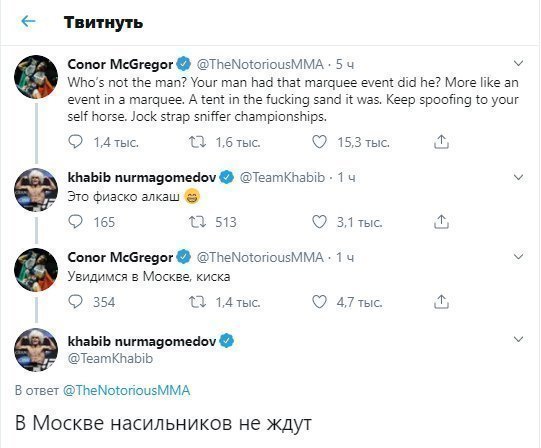 Конор ответил тоже по-русски: «Увидимся в Москве, киска». Хабиб не смолчал. «В Москве насильников не ждут», — заявил дагестанец, намекнув на новый скандал, связанный с ирландцем. В субботу газета The New York Times сообщила, что Макгрегор находится под следствием по делу об изнасиловании 20-летней девушки у паба в Дублине (впрочем, никаких обвинений Конору не предъявлено).