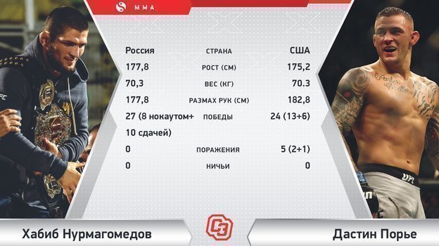 Нурмагомедов — однозначный фаворит, даже несмотря на то, что Порье находится в прекрасной форме. Хабиб — один из немногих бойцов UFC, кто никогда не проигрывал. Рекорд дагестанца — 27 побед, 0 поражений. Рекорд американца — 25 побед, 5 поражений.