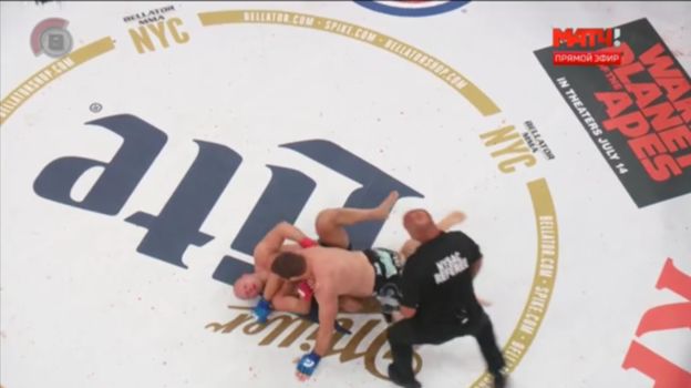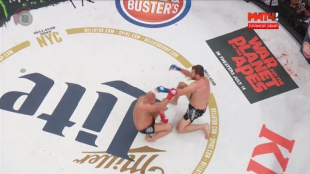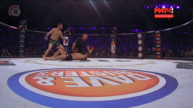 Это был один из первых ударов в бою: Митрион выбрал подходящий момент и полетел вперед с ударом, россиянин кинул в ответ точный встречный. Оба попали и разлетелись в разные стороны, оказавшись на настиле. Ощутимее оказался удар для Емельяненко, поскольку соперник стремительно поднялся и полетел добивать.