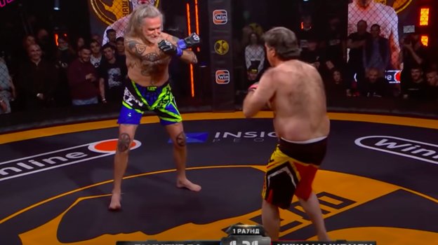 На экране показали данные бойцов: Джигурда — 60 лет, рост 186 см, вес 84 кг; Кушанашвили — 51 год, 175 см, 86 кг. Отар выглядел максимально неспортивно — руки, лишенные мускулов, обрюзгший, довольно массивный живот.