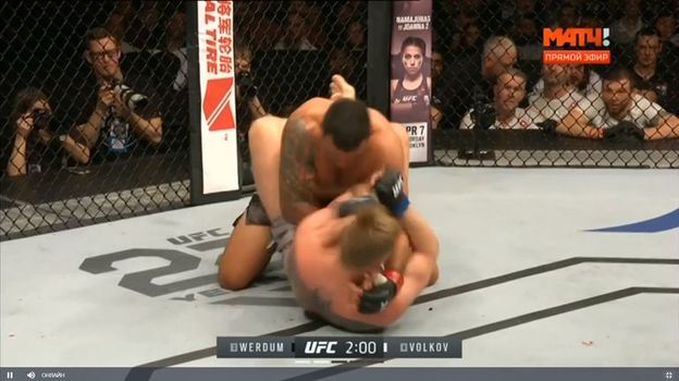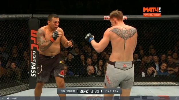 В начале четвертой пятиминутки было очевидно, что Ведрум сильно устал. Из последних сил он провел тейкдаун, затащил Волкова в гарт, но россиянин выбрался и сразу нанес нокаутирующую серию. Пара ударов в челюсть свалила бразильца навзничь, и как только россиянин пошел добивать судья остановил бой. Победа! Таким образом, Волков стал третьим, кто нокаутировал Вердума после Дос Сантоса и Миочича. Теперь ждем Александра в титульном поединке
