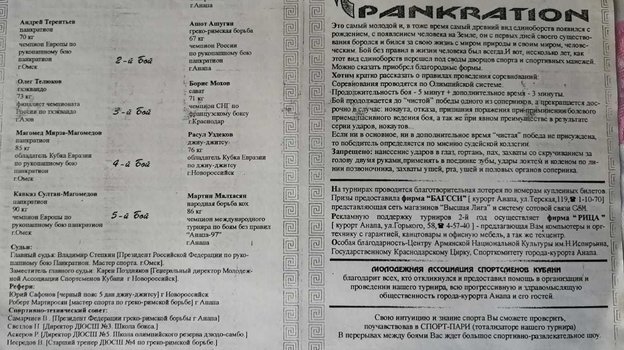 В начале 90-х в Сибири открылась федерация панкратиона — в Анапу она подтянулась в 1993-м и провела там турнир. В нем участвовали мой брат Ашот и Гриша. Ашот в своем весе стал первым, а Гриша — третьим. То был любительский турнир по панкратиону, а потом мы провели и профессиональный.