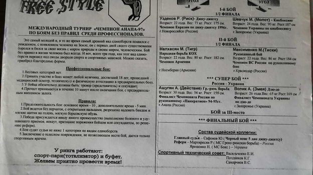 Правила на турнире были простые — пять раундов по три минуты с ограниченным временем на работу в партере, чтобы подолгу там не валялись. Исходили из зрелищности. Дрались в снарядных перчатках — чтобы пальцы были закрыты. Можно было бить головой — как и когда-то в UFC. При этом у нас не было такой жестокости, как в UFC. Ограничений в правилах было немного, но, например, запрещалось бить лежачего руками или ногами. Ну, а удары руками/ногами в стойке, броски, удушающие и болевые приемы — разумеется, все это было разрешено. Когда объявляли бойцов, сообщали, какую школу боевых искусств он представляет. Это мы переняли из фильма «Кровавый спорт» с Ван Даммом. Мне понравилось, что там демонстрировались разные стили единоборств. Наш вечер боев длился 1,5 — 2 часа — как концерт или фильм.