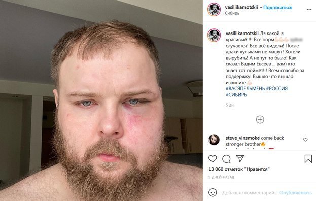 «Ля какой я красивый!!! , — написал Камоцкий в Instagram. — Все норм. * (фигня) случается! Все всё видели! После драки кулаками не машут! Хотели вырубить! А не тут-то было! Как сказал Вадим Евсеев... вам). Кто знает тот поймет!!! Всем спасибо за поддержку! Вышло что вышло, извините».