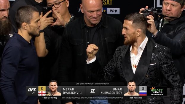 Российский боец Умар Нурмагомедов и американец грузинского происхождения Мераб Двалишвили провели дуэль взглядов перед поединком на UFC 311.