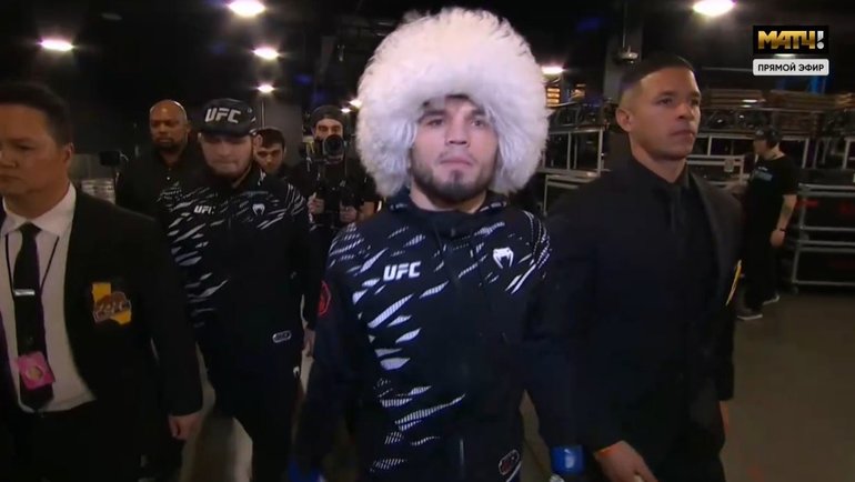 Умар появился в сопровождении Хабиба Нурмагомедова. На 29-летнем спортсмене была белая папаха и выходил он под дагестанскую мелодию.