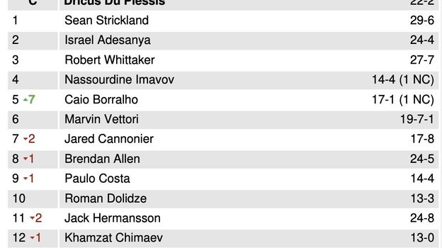 12-й номер рейтинга UFC в среднем весе Кайо Борральо (17-1) поднялся на семь строчек вверх в рейтинге среднего веса, заняв пятую строчку после победы над Джаредом Каннонье (17-8) единогласным решением судей (49-45, 49-45, 48-46) на UFC on ESPN 62. Бой состоялся 25 августа в UFC Apex в Парадайсе, США.