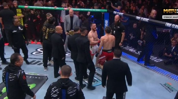 Рукопожатие бойцов состоялось перед объявлением результата поединка. Двалишвили победил россиянина единогласным решением судей, нанес ему первое поражение в карьере и защитил титул чемпиона UFC в легчайшем весе.
