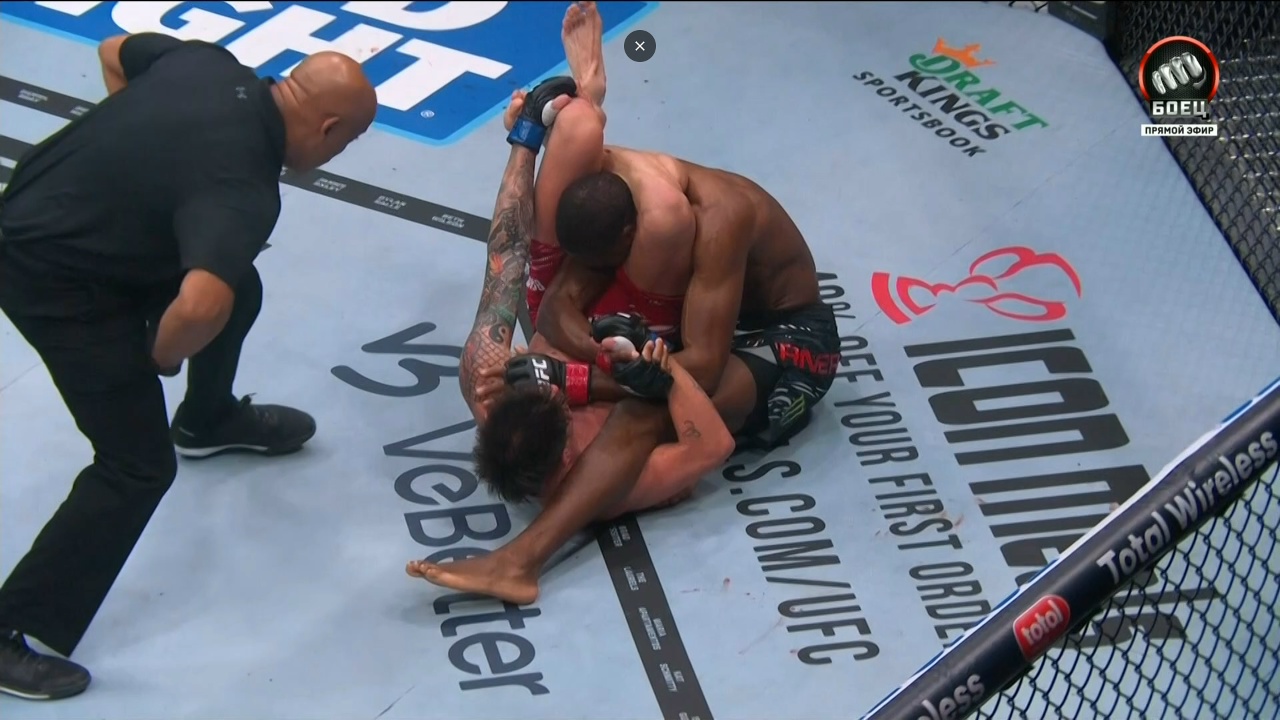 Раунд 1. Обменялись высокорослые парни парой острых атак в стойке, затем Тернер провел тейкдаун, Бахамондес грамотно отработал из позиции лежа на спине, активно отбивался локтями, а затем накинул треугольник, и заставил постучать американца.