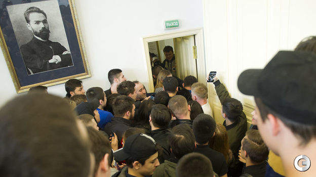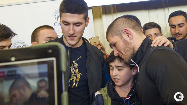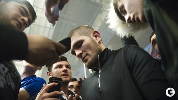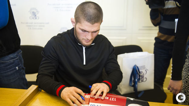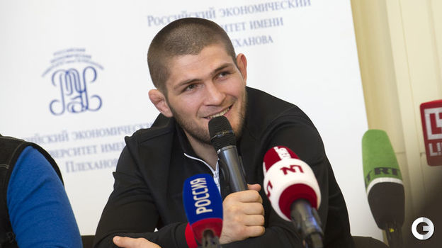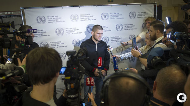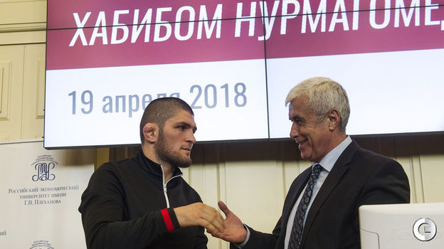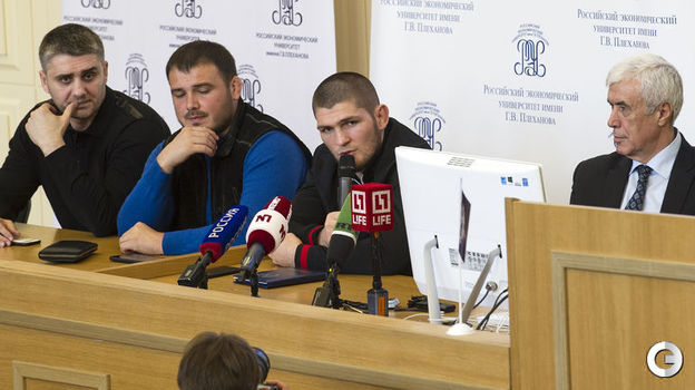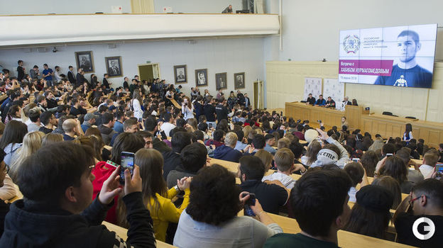 Первый российский чемпион UFC в легком весе Хабиб Нурмагомедов провел встречу со студентами РЭУ имени Г.В.Плеханова в Москве. После нее публика довольно долго не отпускала бойца. Удивительно, как ему удалось сохранить спокойствие под давлением толпы. Видео - здесь.