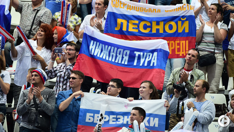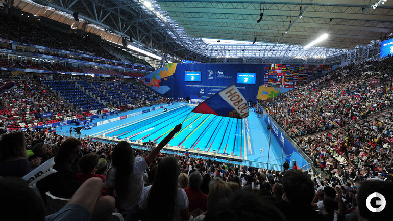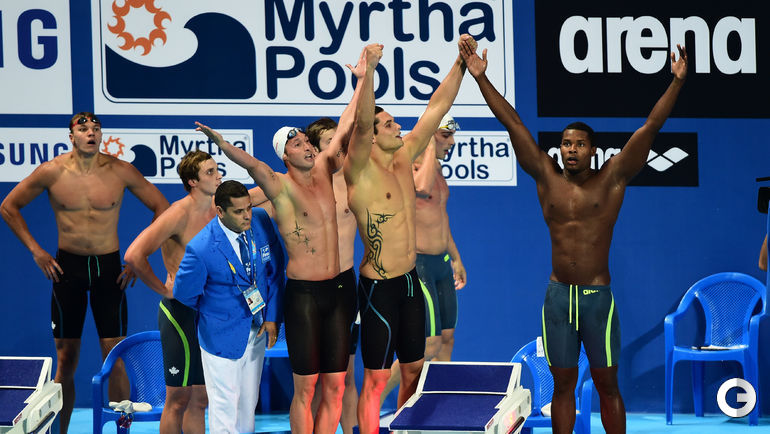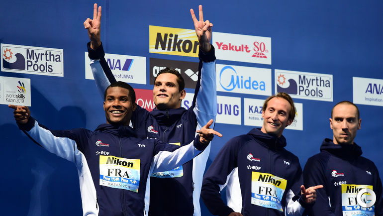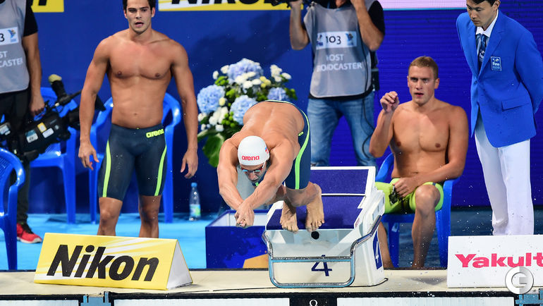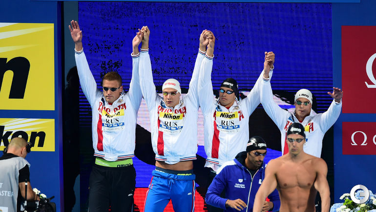 Сборная России в составе Андрея Гречина, Никиты Лобинцева, Владимира Морозова и Александра Сухорукова заняла второе место в эстафете 4x100 м вольным стилем на чемпионате мира в Казани. Золото досталось Франции, бронза - Италии. Фото Александра Федорова, "СЭ"