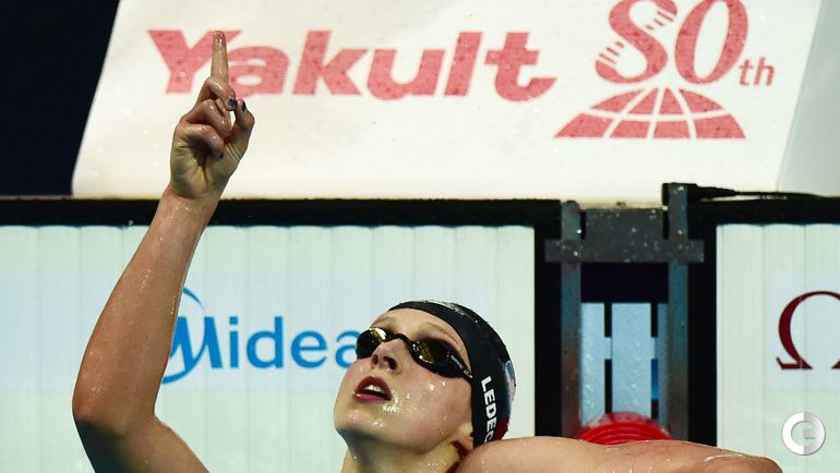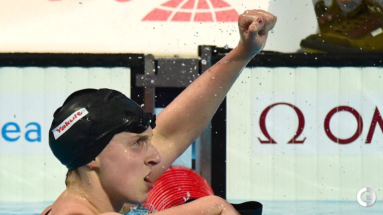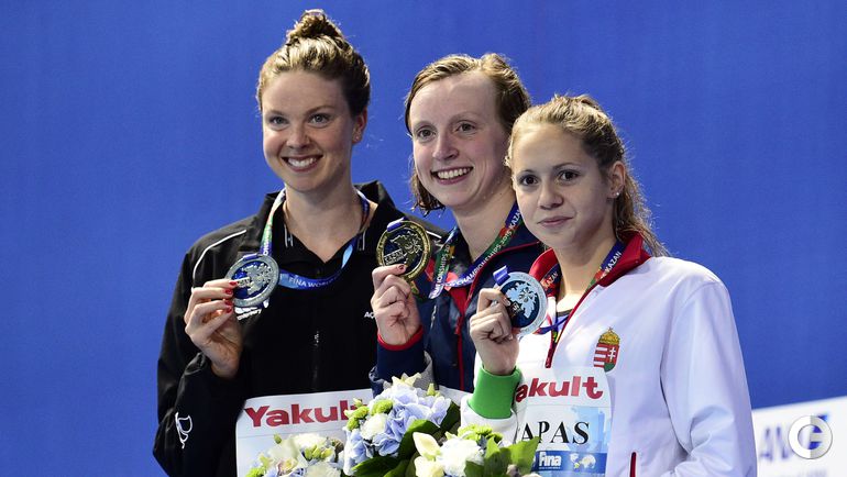 Американка Кэти Ледецки завоевала золото ЧМ-2015 в Казани на дистанции 1500 м вольным стилем. 18-летняя спортсменка проплыла дистанцию аз 15.25,48 и на 2,29 секунды обновила собственный мировой рекорд, установленный накануне в полуфинале. Второй стала Лорен Бойл из Новой Зеландии, бронза - у венгерки Богларки Капаш. Фото AFP