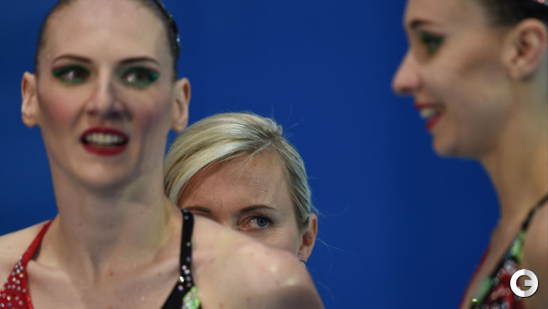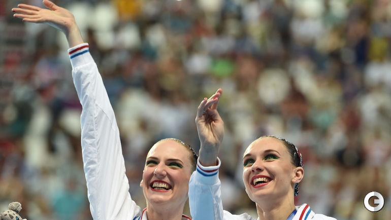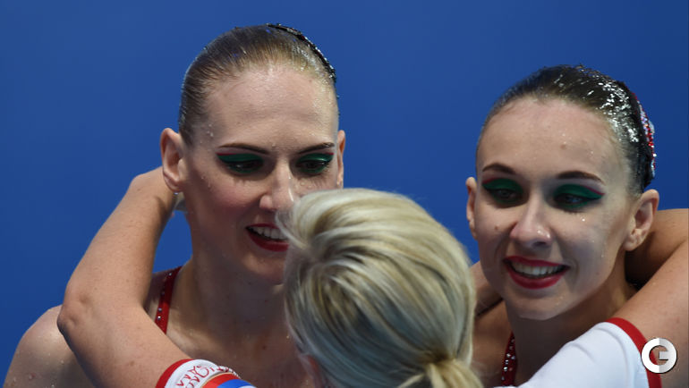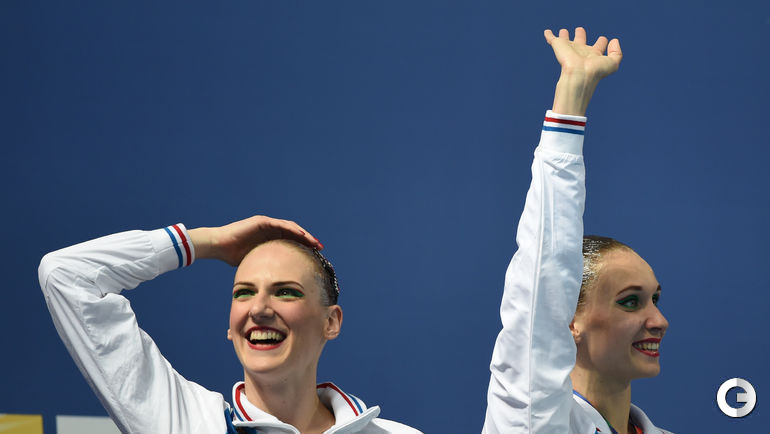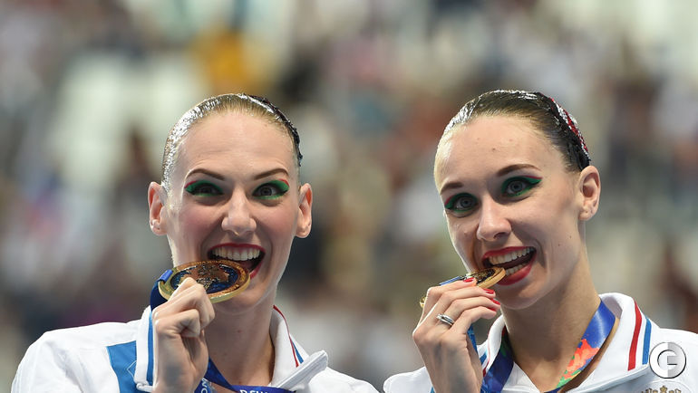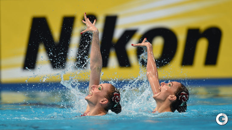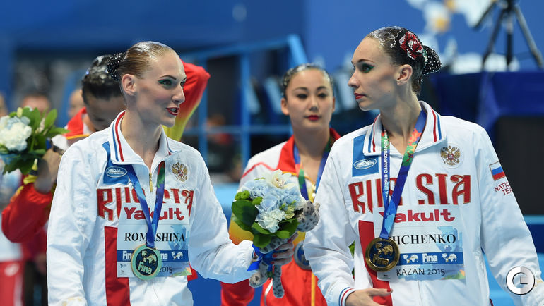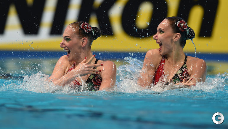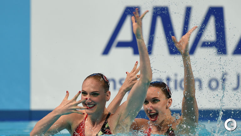 Россиянки Наталья Ищенко и Светлана Ромашина завоевали золото в технической программе дуэтов на чемпионате мира по водным видам спорта, проходящем в Казани. Второе место заняли Хуан Сюэчэнь и Сун Вэньянь из Китая, замкнули тройку японки Юкико Инуи и Рисако Мицуи. Для Ищенко и Ромашиной этот титул стал 17-м на мировых первенствах в карьере. Фото Александр Федоров, "СЭ"