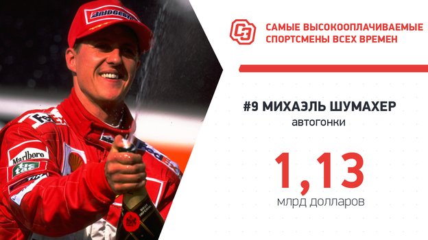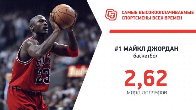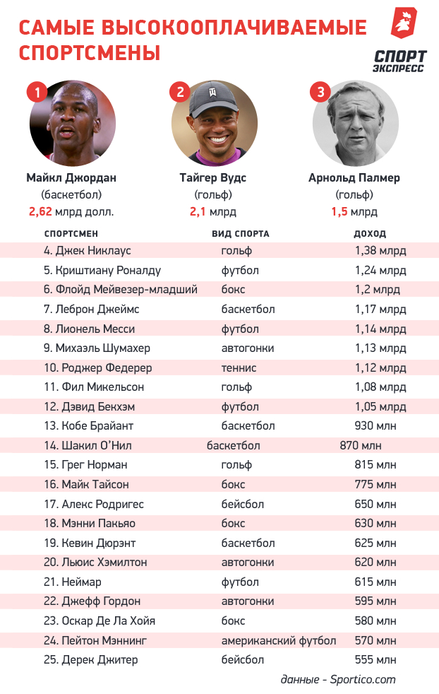 №1 в этом списке — баскетболист Майкл Джордан. Только он и гольфист Тайгер Вудс взяли планку в 2 миллиарда долларов.