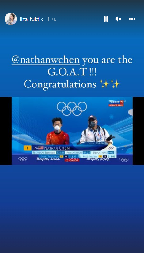 «Нэтан Чен, ты GOAT (величайший (фигурист) всех времен). Поздравляю!» — написала Туктамышева.