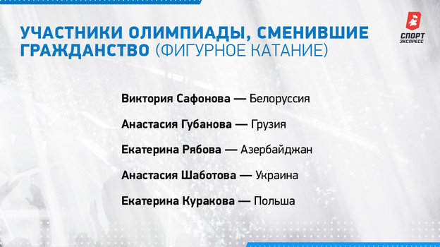 Для большинства сборных в фигурном катании заполучить россиянина, который к тому же останется тренироваться в России, — хороший способ улучшить свои результаты. Сборная Грузии благодаря натурализации россиян примет участие в командном турнире с неплохими шансами на попадание в топ-5. Все шесть человек в составе ее команды родились в России! Среди них есть этнические грузины, как Морис Квителашвили, Георгий Ревия и Лука Берулава, а вторая половина — российские девушки Анастасия Губанова, Карина Сафина и Мария Казакова. Израиль нашел своих одиночников на Украине, а Болгарии отдал Александру Фейгин. Китайцы для своей Олимпиады натурализовали этническую китаянку Чжу И из США.