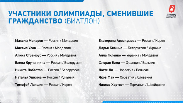 В биатлоне из России люди кочуют в Белоруссию и Молдавию, перед Пхенчханом пачкой россиян запаслась Южная Корея. Также национальным хантингом занялась Бельгия. Яков Фак давно перешел из Хорватии в Словению ради тренировочных условий.
