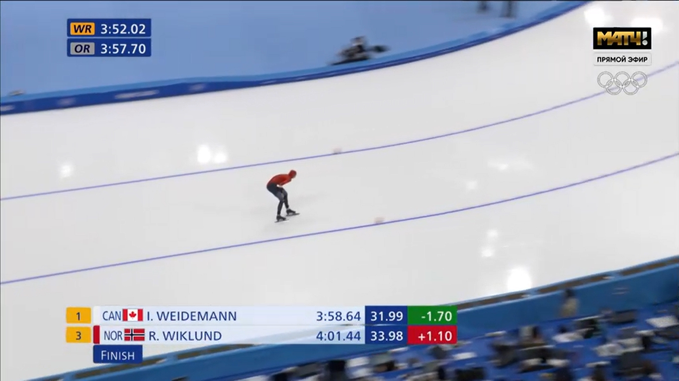 А далее канадка Изабелль Вайдеман первой выбегает из четырех минут и, очевидно, становится главной претенденткой на золотую медаль — 3.58,64. А норвежка Рагне Виклунн показывает третье время дня — 4.01,44.