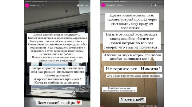 Как человек, который прошел через этот опыт, хочу сразу им поделиться. Бегите от людей, которые ждут ваших ошибок. Бегите от людей, которые по сто раз говорят, что у вас не получится. Куда бежать, если это руководители, я пока не знаю. А внутри, к сожалению, война! Война между своими, которую мы все пытались скрыть уже очень долгое время. Это самое страшное, самое разрушительное, что может быть для каждого спортсмена, который был в этом замешан. Самое страшное, что в тебе убивают любовь к спорту, которому ты посвятил жизнь», – написала Никитина в сторис Instagram.