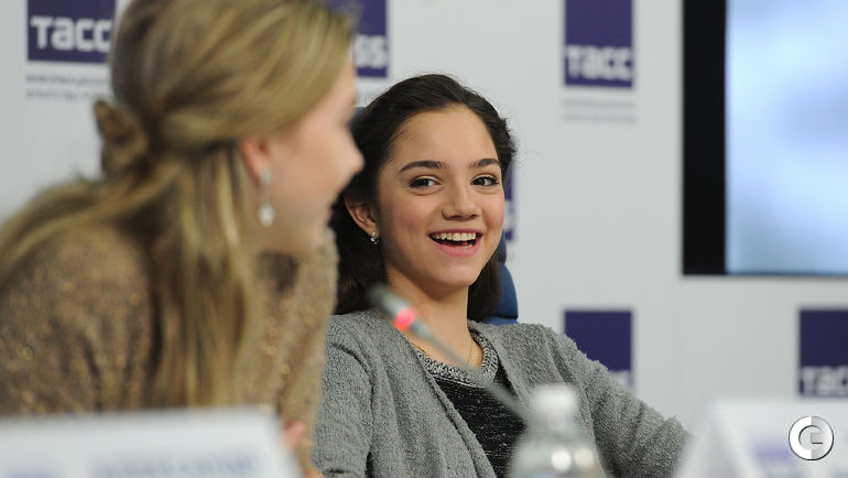 Российские фигуристки Елена Радионова, Евгения Медведева, Анна Погорилая после триумфального выступления на чемпионате Европы в Братиславе, где выиграли все медали, дали пресс-конференцию в Москве.
