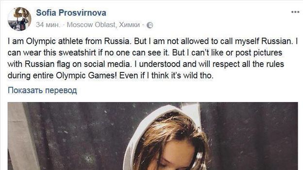 - Я олимпийский атлет из России. Но мне нельзя называть себя русской, - написала Просвирнова в Инстаграме. - Я могу носить этот свитшот, только если никто его не видит. Но я не могу лайкать или публиковать фотографии с российским флагом в социальных сетях. Я понимаю и буду уважать эти правила во время Олимпийских игр. Даже если считаю, что это дикость.