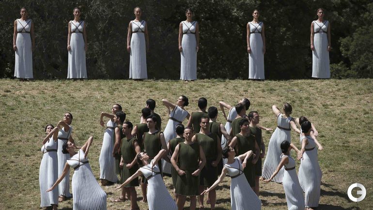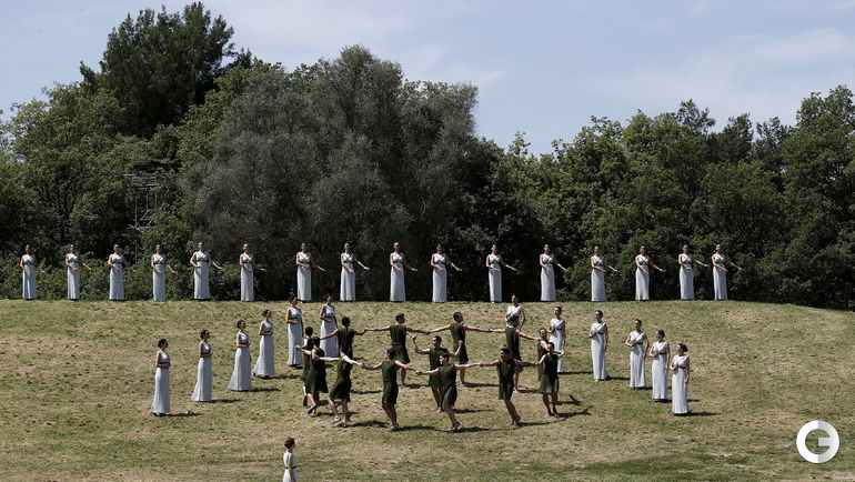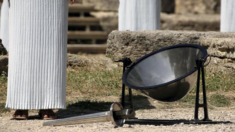 На знаменитой горе Олимпии в Греции одиннадцать женщин, изображающих греческих жриц, провели репетицию зажжения Олимпийского огня Игр в Рио. Верховная жрица, роль которой в этом году исполняет греческая актриса Катерина Лехоу, должна будет завтра зажечь огонь с помощью параболического зеркала, фокусирующего лучи Солнца.