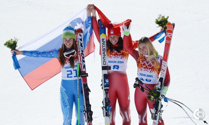 Сочи. XXII Олимпийские зимние игры. Женщины. Скоростной спуск. 1. Мазе (Словения) – 1.41,57. 1. Д. Гизин (Швейцария) – 1.41,57. 3. Гут (Швейцария) – 1.41,67. Фото AFP, REUTERS