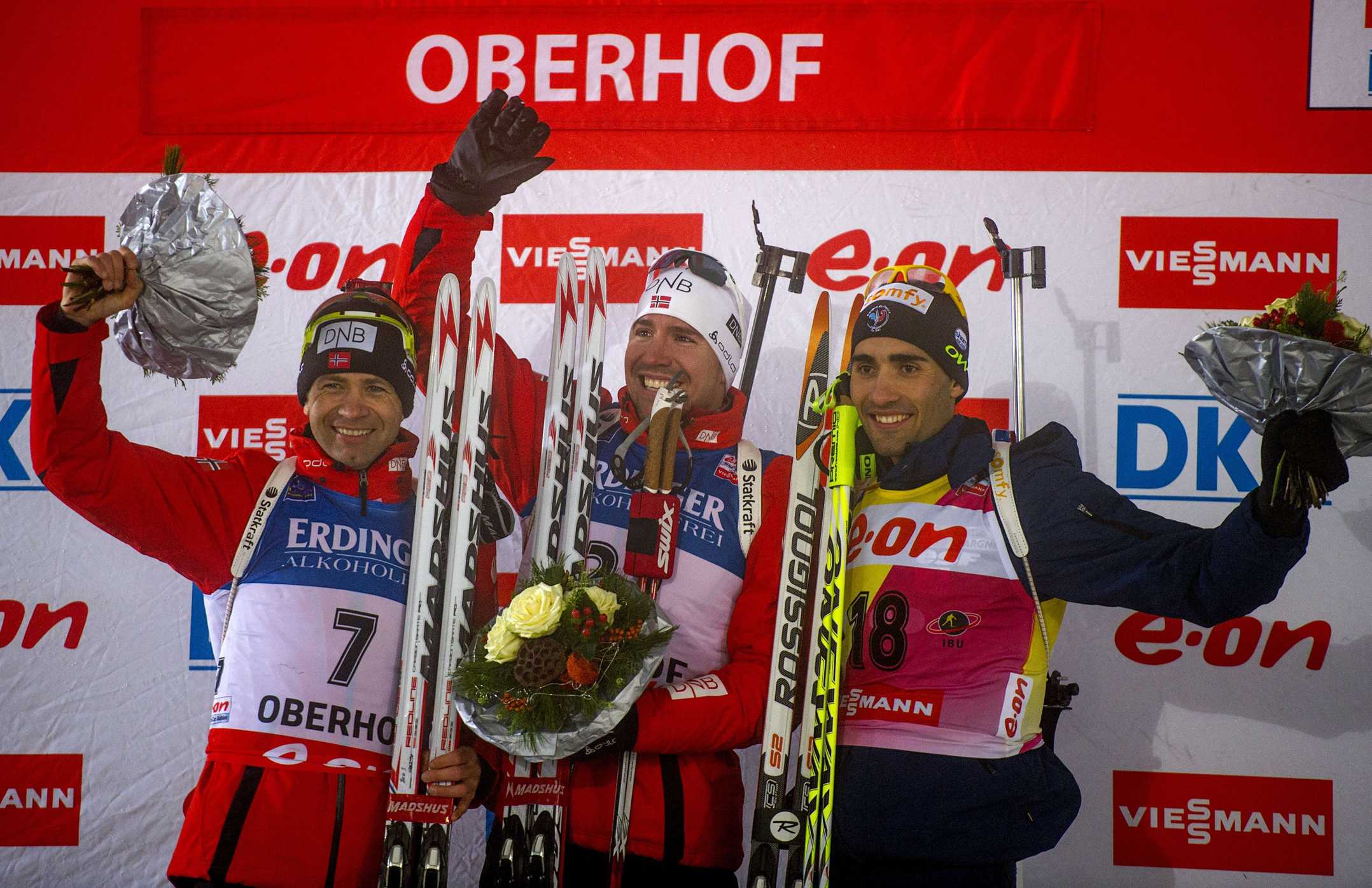 Лидер Кубка мира Мартен Фуркад, допустив три промаха, на финише был третьим, уступи победителю – 21,7 секунды.