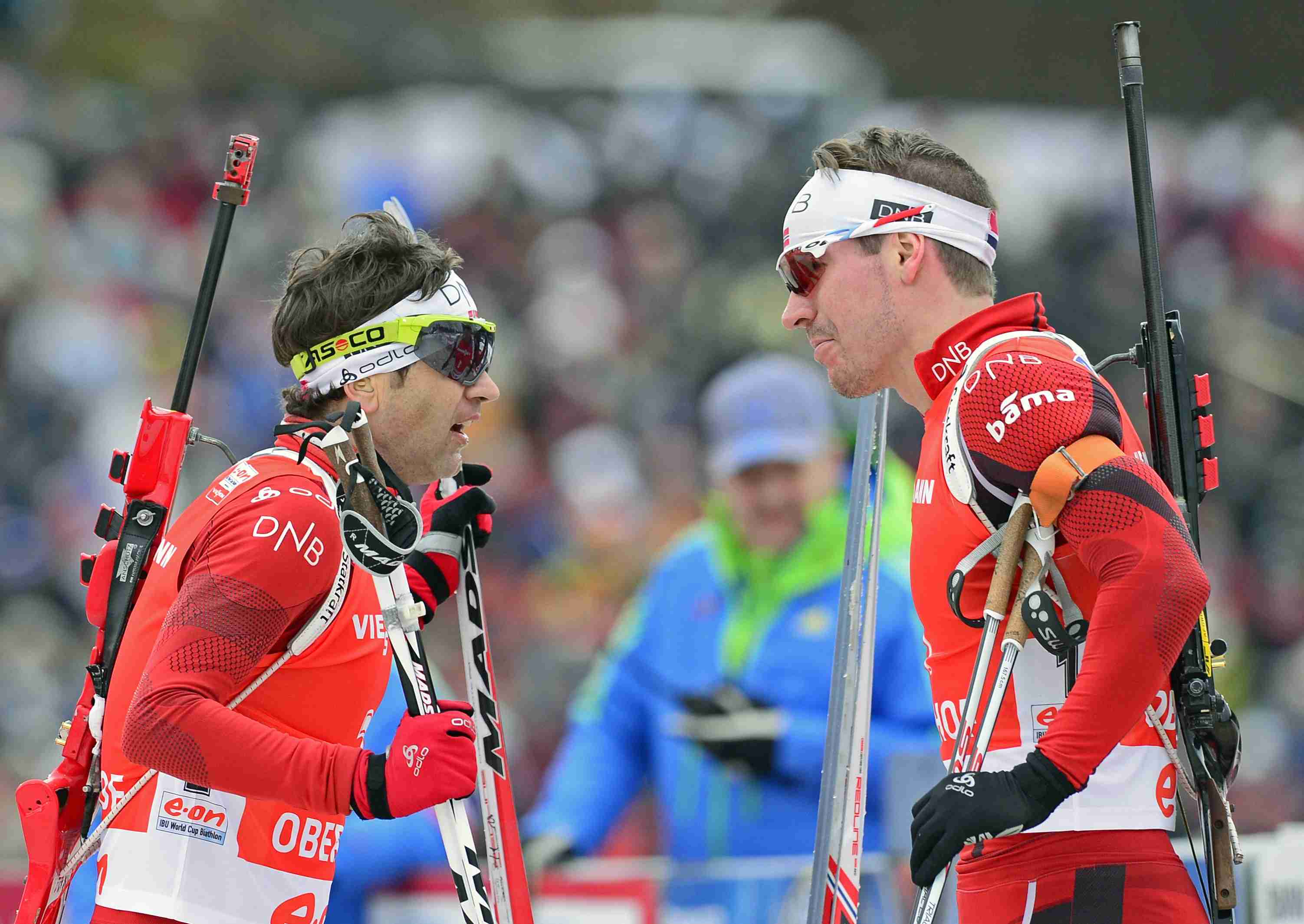 Триумфаторы мужской гонки преследования из Норвегии - занявший второе место Оле Эйнар Бьорндален беседует со своим партнером по команде Эмилем Хегле Свендсеном, который минутами ранее первым финишировал первым.