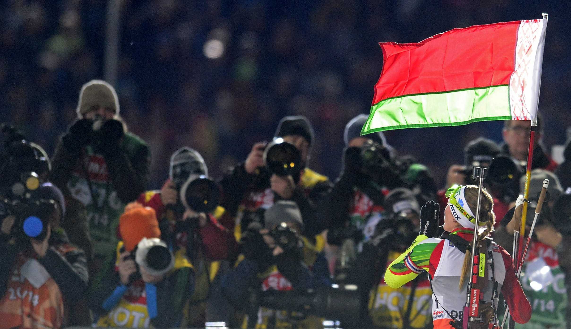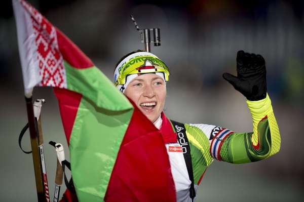 Дарья Домрачева вновь оказалась самый точной и самой быстрой. После финиша можно дать волю эмоциям, и триумфатор из Белоруссии позирует фотокорреспондентам с флагом своей страны.