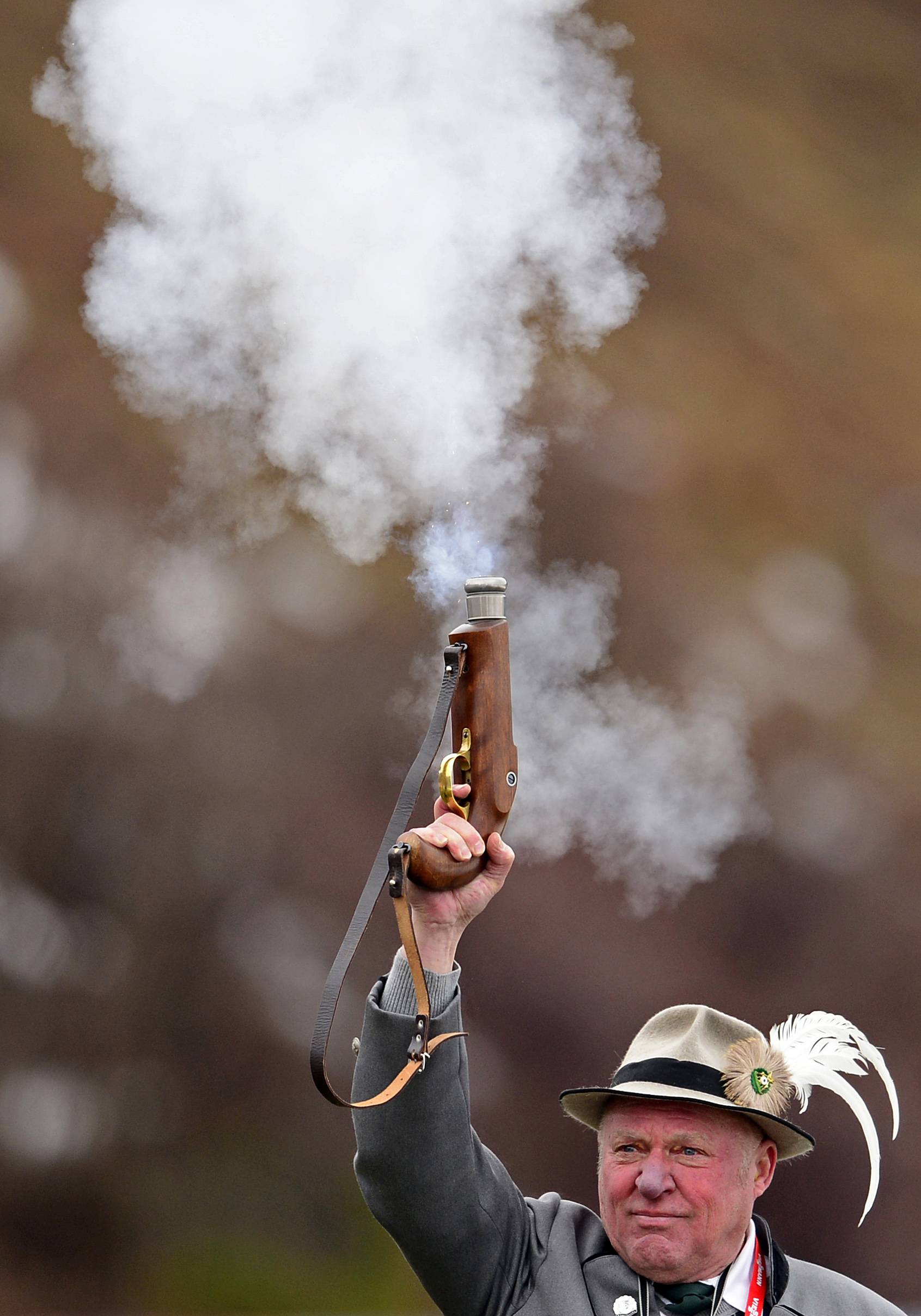 Обязательный ритуал этапа в Оберхофе: выстрел на церемонии награждения в исполнении мужчины в традиционном наряде местной стрелковой ассоциации.