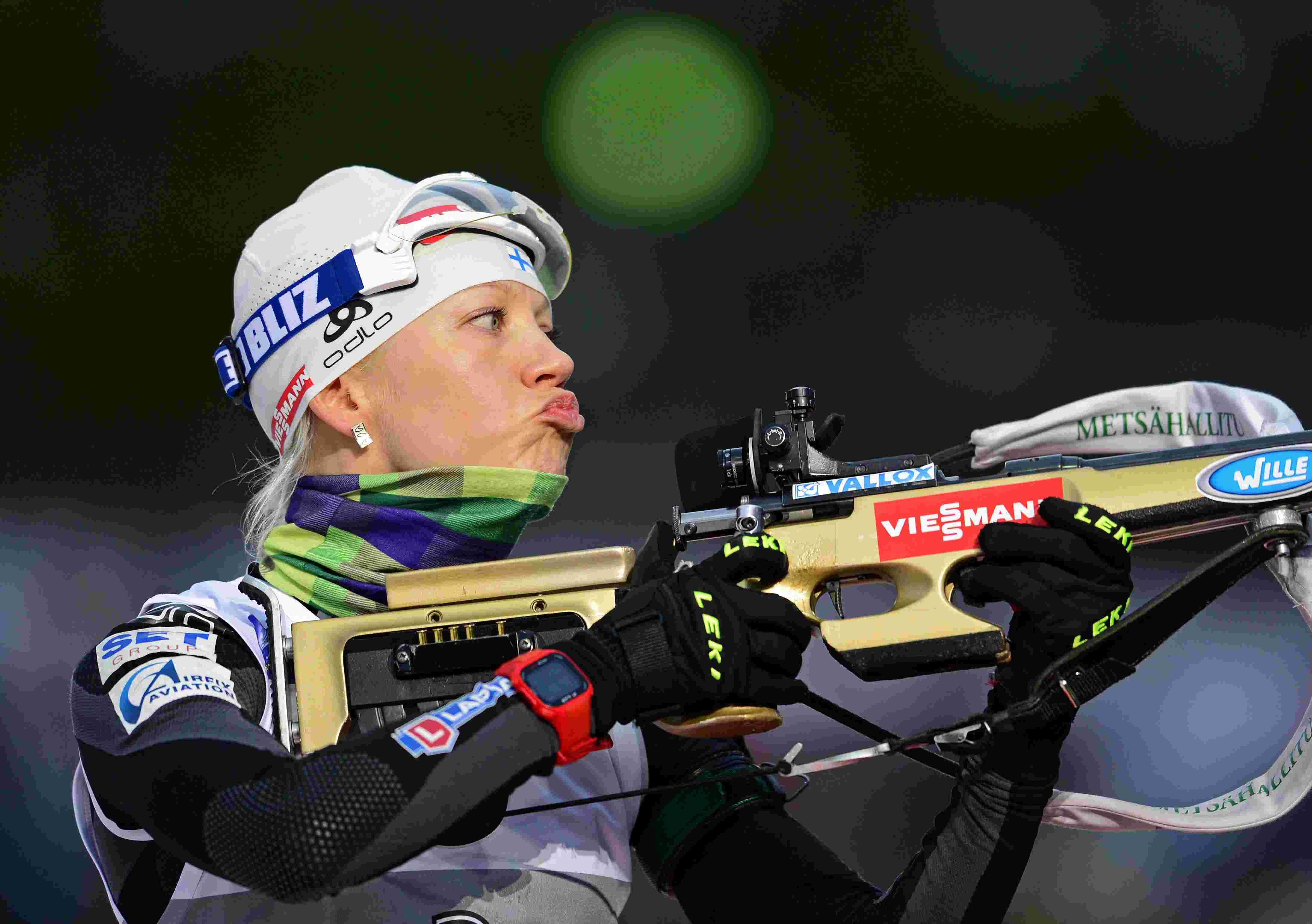 Второй призер женской гонки преследования - финская биатлонистка Кайса Мякяряйнен - настраивается на очередную стрельбу.