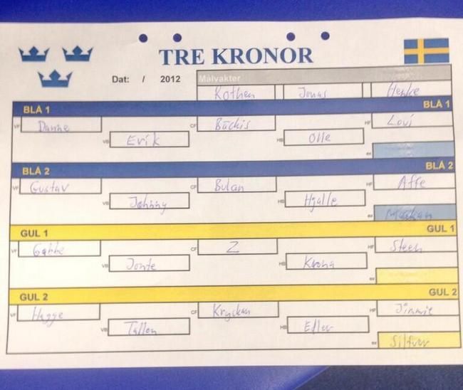 Тренерский штаб сборной Швеции во главе с Пером Мортсом определился с сочетаниями игроков, в которых команда начнет турнир. Пятерки сформированы следующим образом: Эрик Карлссон ("Оттава") – Оливер Экман-Ларссон ("Финникс"). Даниель Седин ("Ванкувер") – Никлас Бэкстрем ("Вашингтон") – Луи Эрикссон ("Бостон"). Джонии Одуйя ("Чикаго") – Никлас Хьялмарссон ("Чикаго"), Густав Нюквист ("Вашингтон") – Патрик Берглунд ("Сент-Луис") – Даниель Альфредссон ("Детройт"). Никлас Кронвалл ("Детройт") – Джонатан Эрикссон ("Детройт"), Габриэль Ландеског ("Колорадо") – Хенрик Зеттерберг ("Детройт") – Александр Стин ("Сент-Луис"). Хенрик Талиндер ("Баффало") – Александр Эдлер ("Ванкувер"). Карл Хагелин ("Рейнджерс") – Маркус Крюгер ("Чикаго") – Джимми Эрикссон ("Шеллефтео").