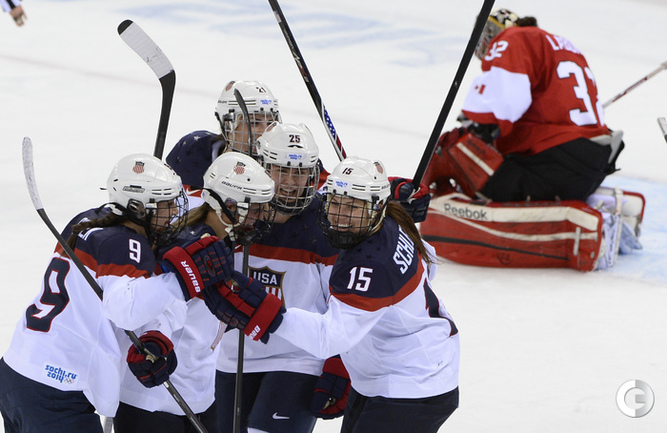 Хоккей. Сочи. XXII Олимпийские зимние игры. Женщины. Групповой турнир. Группа A. Канада – США – 3:2 (0:0, 0:1, 3:1). Голы: Найт – 3 (бол., Карпентер, Склепер), 37:34 – 0:1. Агоста-Марсиано – 2 (бол., Уикенхейзер), 42:21 – 1:1. Уикенхейзер – 2 (Спунер, Агоста-Марсиано), 43:54 – 2:1. Агоста-Марсиано – 3, 54:55 – 3:1. Склепер – 1, 58:55 – 3:2. Фото AFP
