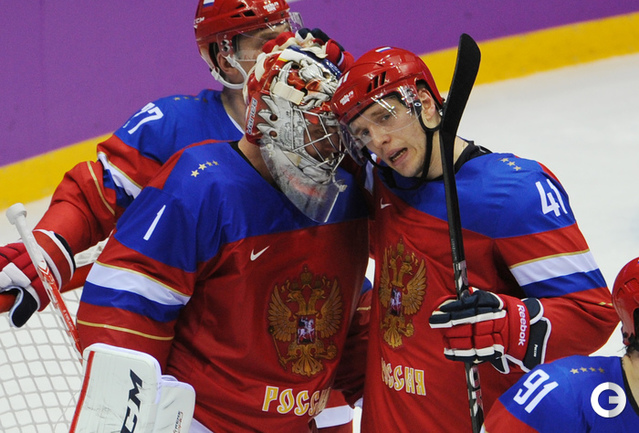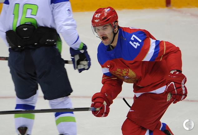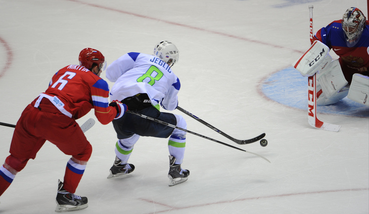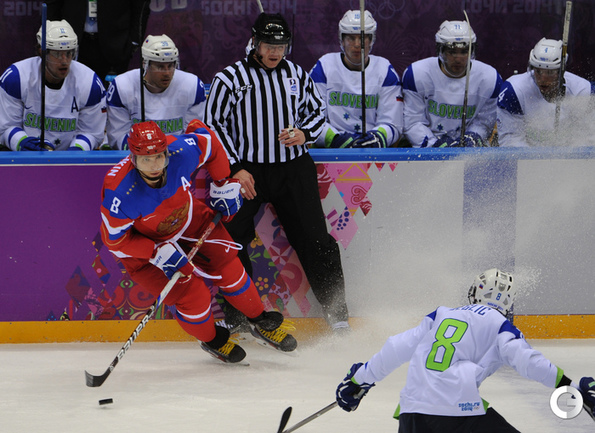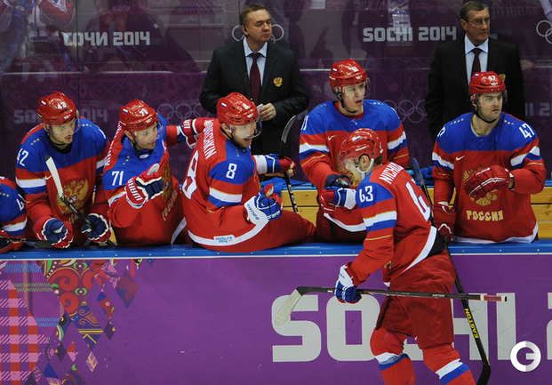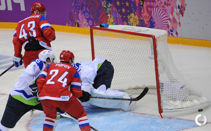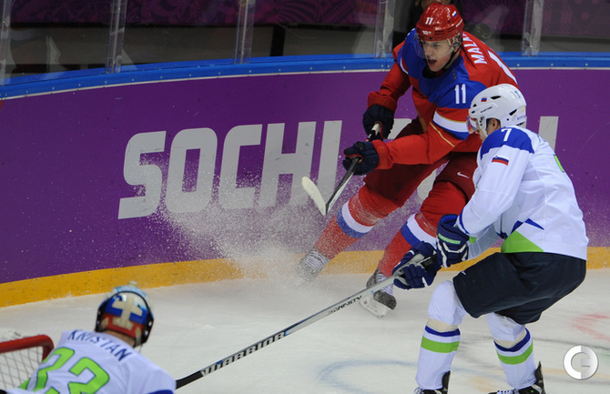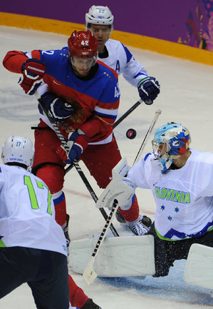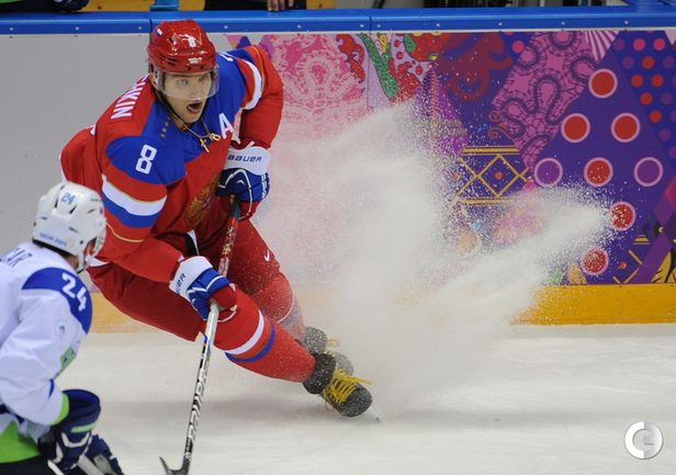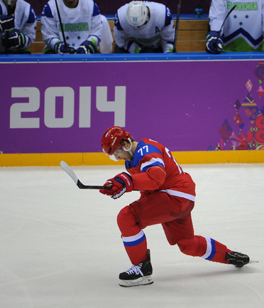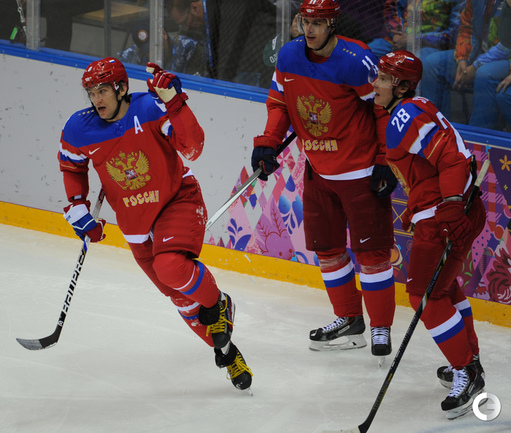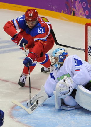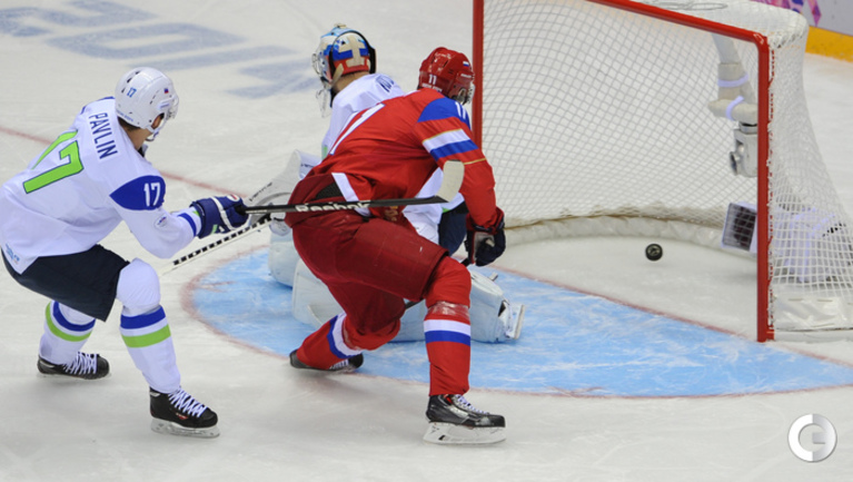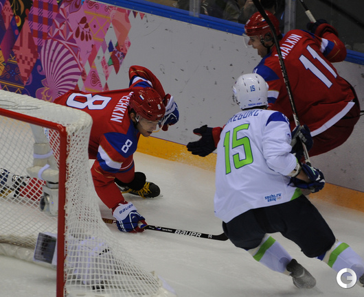 Сборная России с победы над Словенией начала групповой олимпийский турнир в Сочи. Самым результативным игроком встречи стал форвард Евгений Малкин, отметившийся 3 (1+2) очками. Кроме того, 2 (1+1) очка записал на свой счет Александр Овечкин. Фото - Александр ФЕДОРОВ, "СЭ"