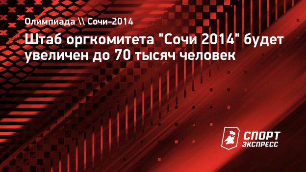 Президент организационного комитета "Сочи 2014" Дмитрий Чернышенко сообщил, что на момент открытия ХХII Олимпийских зимних игр штаб организации будет увеличен до 70 тысяч человек.