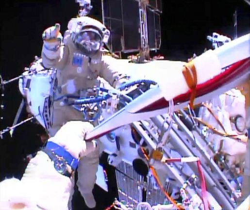 Российские космонавты вынесли олимпийский факел в открытый космос