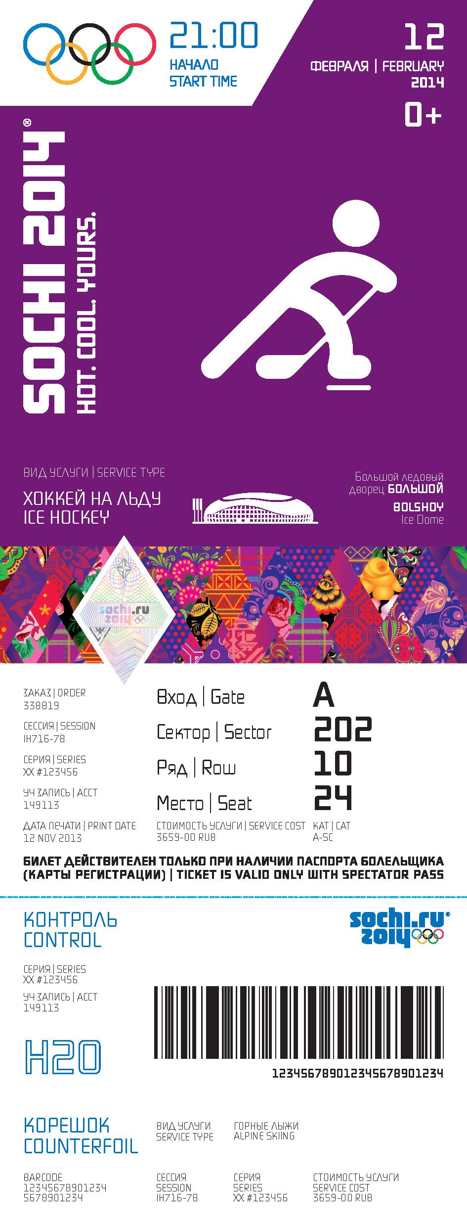 На лицевой стороне сувенирного билета помимо пиктограммы указаны название объекта и дисциплина, на которую куплен билет, нанесен олимпийский символ – пять колец, словесное обозначение "Sochi 2014" и слоган зимних Игр в Сочи на английском языке – "Hot. Cool. Yours." Аналогичное обозначение на русском языке – "Сочи 2014" и слоган "Жаркие. Зимние. Твои." напечатано на оборотной стороне билета. Также на обороте содержатся правила приобретения и использования билетов, логотипы всемирных олимпийских партнеров и техническая информация.