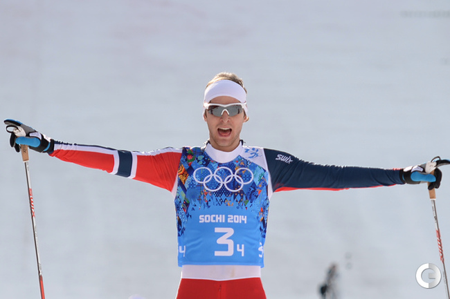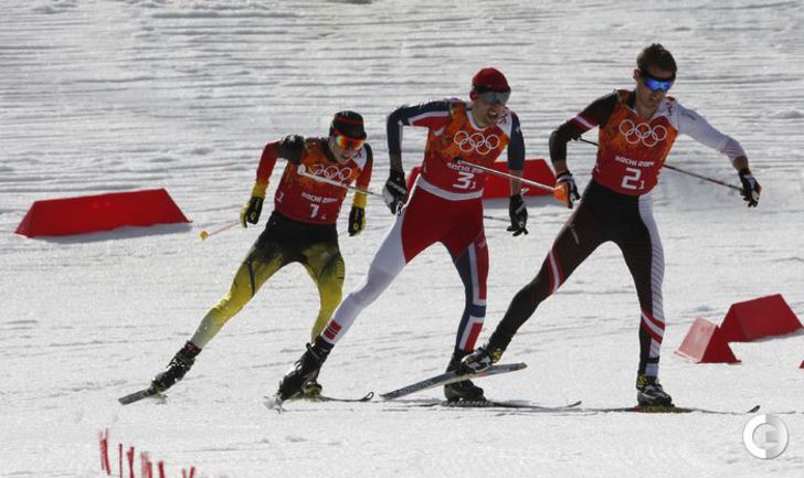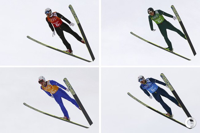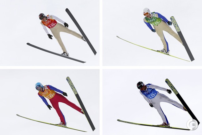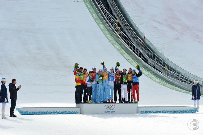 Сочи. XXII Олимпийские зимние игры. Мужчины. Командные соревнования. К-125 + эстафета 4 x 5 км. 1. Норвегия (Моан, Крог, Гробак, Клеметсен) – 47.13,5 (отставание на старте – 0.25). 2. Германия (Риссле, Кирхайзен, Ридзек, Френцель) – отставание 0,3 (0). 3. Австрия (Клапфер, Билер, Штехер, Грубер) – 3,4 (0.07). 9. РОССИЯ (ЯХИН, НАБЕЕВ, ПАНИН, КЛИМОВ) – 5.36,3 (1.14). Фото AFP, REUTERS