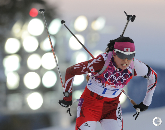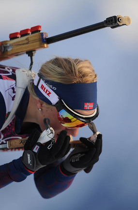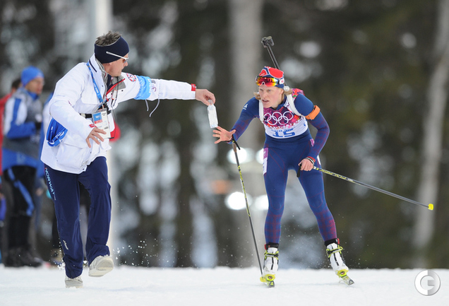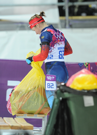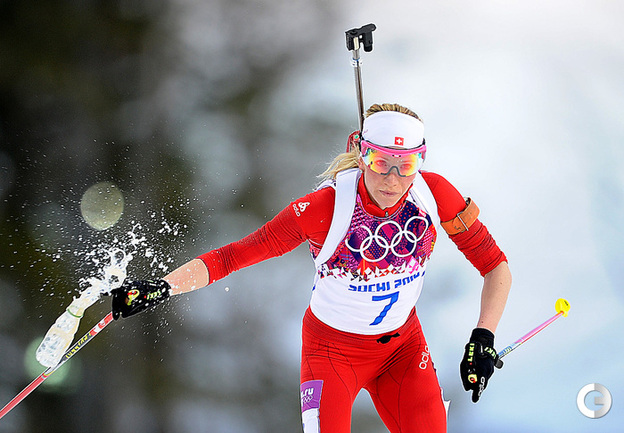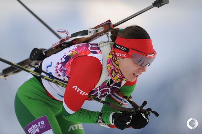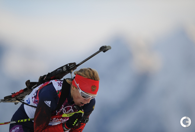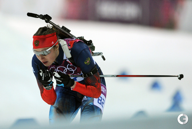Биатлон. Сочи. XXII Олимпийские зимние игры. Женщины. Индивидуальная гонка. 15 км. 1. Домрачева (Белоруссия) – 43.19,6. 2. С. Гаспарин (Швейцария) – отставание 01.15,7. 3. Скардино (Белоруссия) – 01.38,2. Лучшая из россиянок Ольга Зайцева финишировала 15-й, допустив 2 промаха. Фото - Федор УСПЕНСКИЙ, "СЭ"
