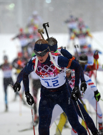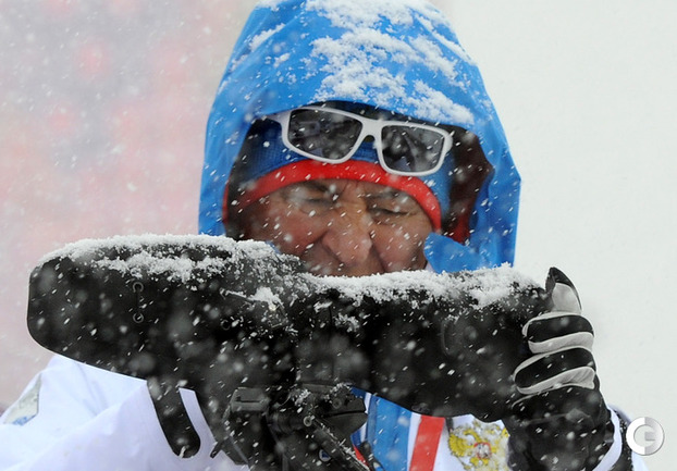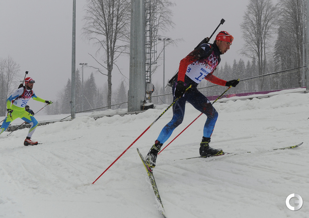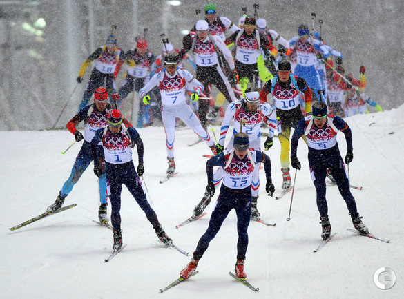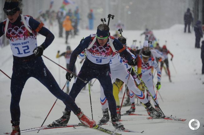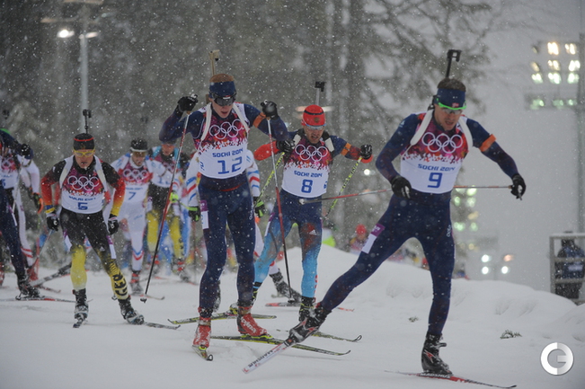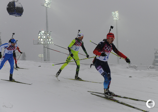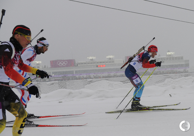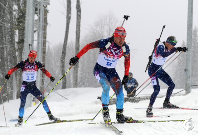 Биатлон. Сочи. Олимпийские игры. Мужчины. Масс-старт. 15 км. 1. Свендсен (Норвегия) - 42.29,1 (0 шт. кругов). 2. М. Фуркад (Франция) - отставание 0,0 (1). 3. Моравец (Чехия) - 13,8 (0). 4. Фак (Словения) - 28,2 (2). 5. ГАРАНИЧЕВ (Россия) - 56,2 (3). Фото - Федор УСПЕНСКИЙ, "СЭ"